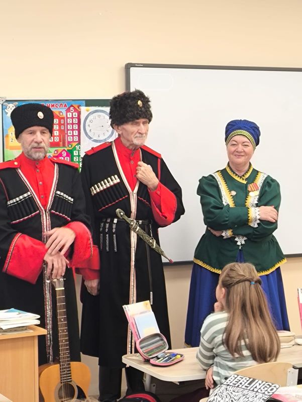 В ходе встречи гости рассказали ученикам о богатой культуре и традициях казаков, их быте. Кроме того, ансамбль показал традиционные казачьи костюмы — яркие, украшенные вышивкой и декоративными элементами, что вдохновило детей взглянуть на казачью культуру с уважением и интересом. Были исполнены казачьи народные песни: их мелодии звучали очень красиво и проникновенно.