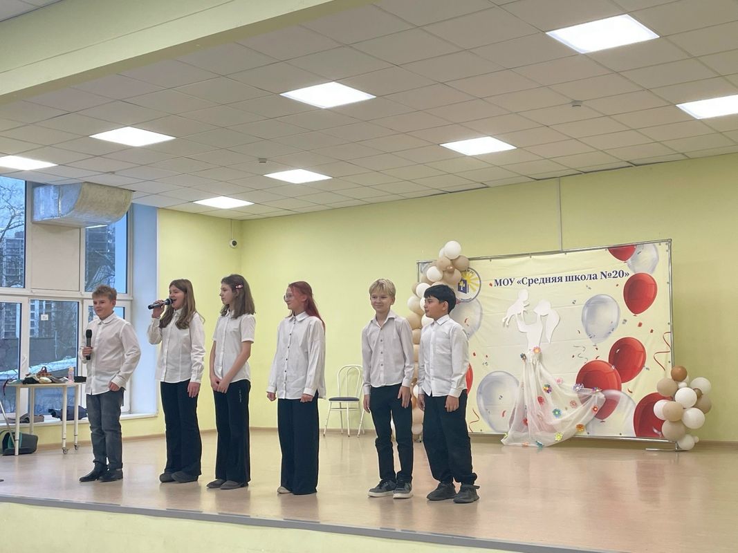 На сцене выступили талантливые ребята из начальной школы: учащиеся 1а, 2а и 4б классов, а также 5а, 5б и 5В классов. Особую атмосферу создал сводный хор 5-ых классов под руководством Тимофеевой Ю.Г., который поразил всех зрителей своим выступлением.