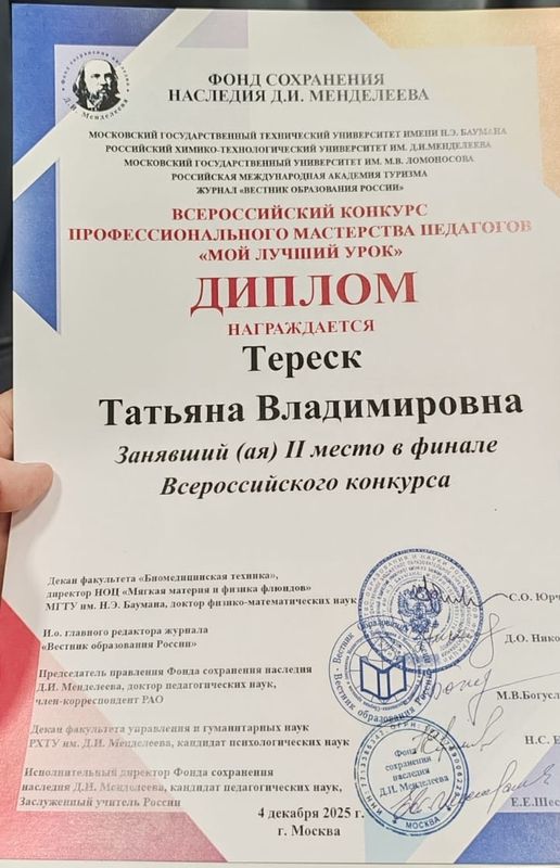 Мы рады сообщить, что учитель русского языка и литературы Тереск Татьяна Владимировна заняла второе место во Всероссийском конкурсе "Мой лучший урок"! Это замечательное достижение, которое подчеркивает высокий уровень профессионализма и преданность своему делу.