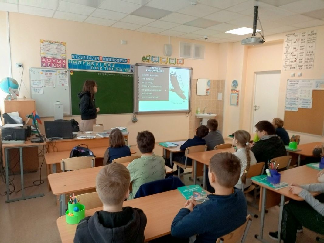 Уже в третий раз к ребятам из 3 Ги Д, 4Д и Е классов приходит работник Национального парка "Водлозерский" Олеся Александровна. 12 февраля занятие было посвящено уникальному животному, редкой птице Орлану-белохвосту. Его называют "аристократом неба" Его длина может достигать 90 сантиметров, а вес — семи килограмм. Чтобы поднять в воздух такую массу, требуется немалая подъемная сила. Ее создают мощные крылья, размах которых достигает 2,3 метра! При таких размерах орлан подолгу парит в небесах без единого взмаха. В полете он широко раскрывает крылья и держит в строго горизонтальном положении, отчего напоминает дельтаплан.