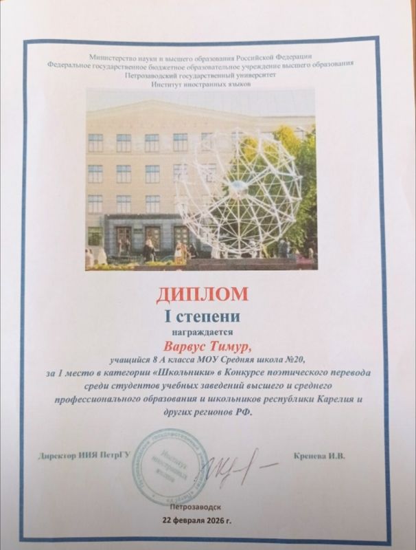 Наш талантливый ученик Варвус Тимур, учащийся 8 А класса, завоевал ДИПЛОМ I СТЕПЕНИ на конкурсе поэтического перевода «Wind on the Hill» среди школьников Республики Карелия и других регионов РФ!